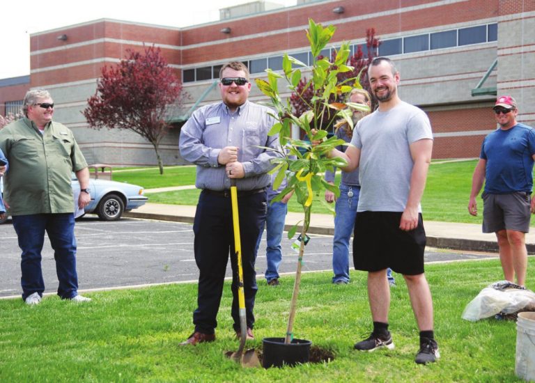 Several faculty and staff at Missouri State University-West Plains (MSU-WP) celebrated Arbor Day April 29 by planting a magnolia tree on the north side of the Lybyer Technology Center. Physical Plant Supervisor Ron Hensley discussed the history and significance of Arbor Day and the importance of trees to the environment. Those attending also were given a silver maple seedling to plant at home. Planting the magnolia tree above are Admissions Counselor Douglas Cooley, foreground left, and custodian Elijah Abdullah, holding the tree. In the background are Hensley, left, and maintenance/ groundskeeper David York. (Missouri State-West Plains photo)